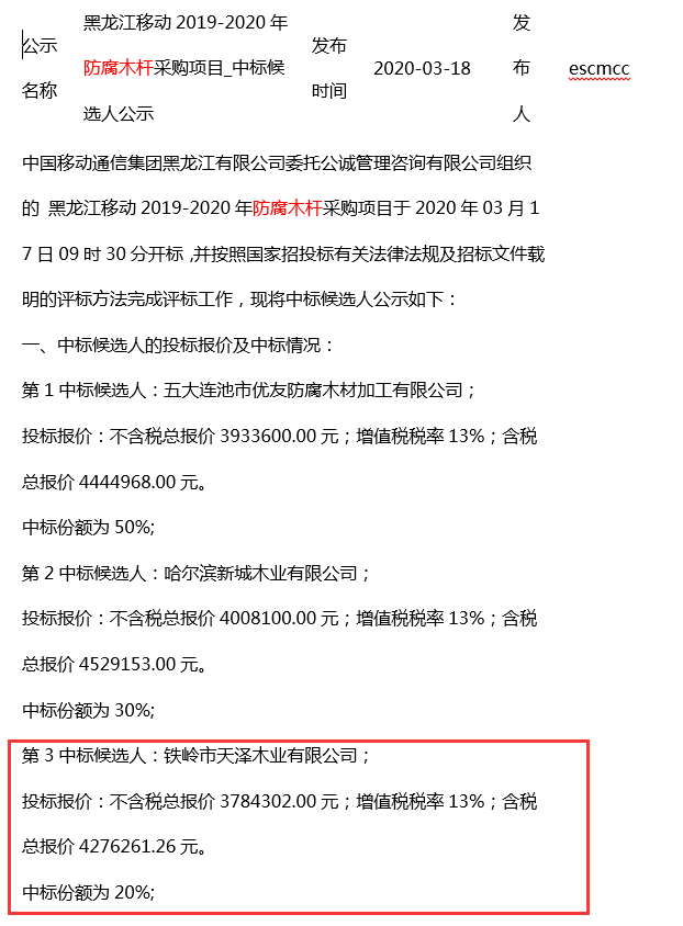 天澤木業(yè)在黑龍江移動(dòng)新年度防腐木桿采購(gòu)項(xiàng)目中中標(biāo)